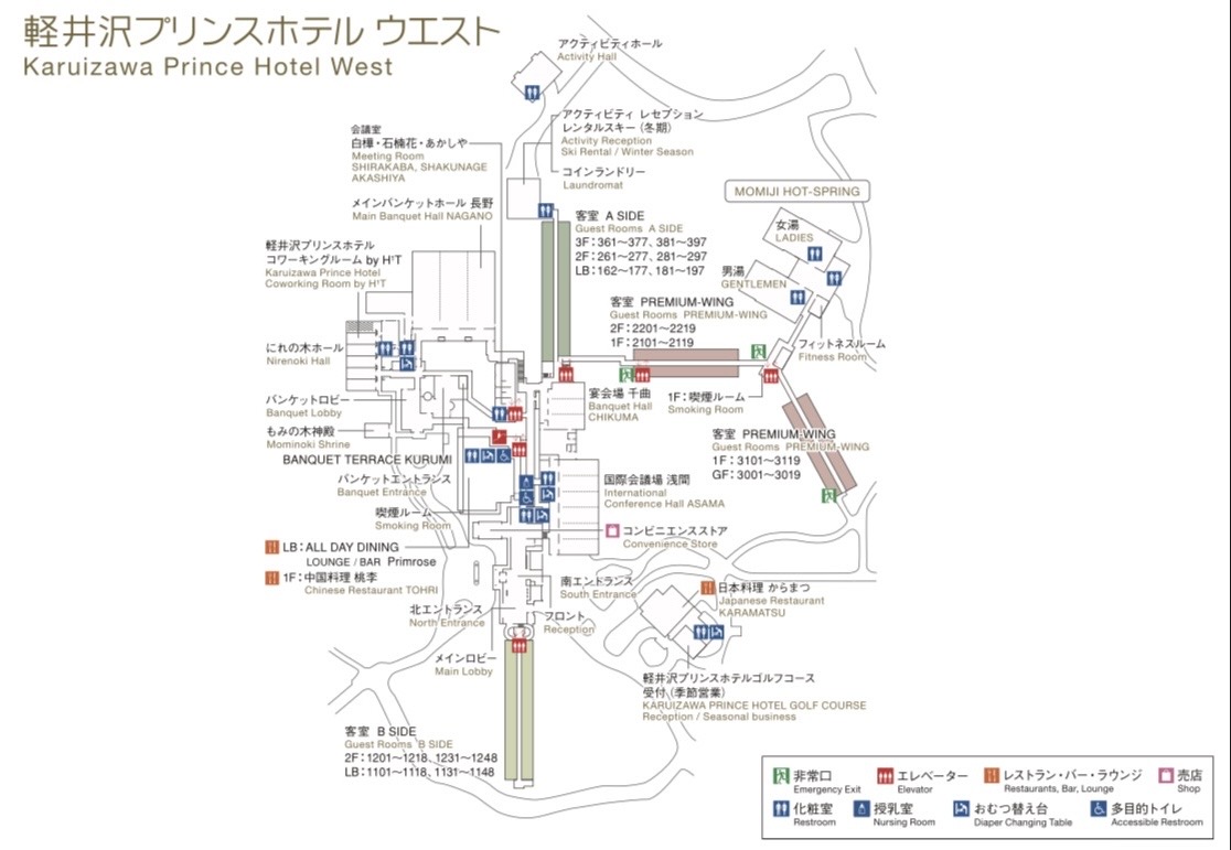 どちらも軽井沢プリンスショッピングプラザやスキー場に隣接する「プリンスグランドリゾート軽井沢」内に位置しており、両ホテル間は無料シャトルバスで行き来することができます。