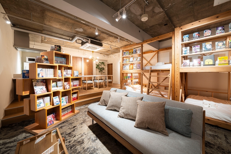 館内ラウンジには漫画棚があり、滞在中は自由に漫画を手に取って読めるスペースが魅力!
